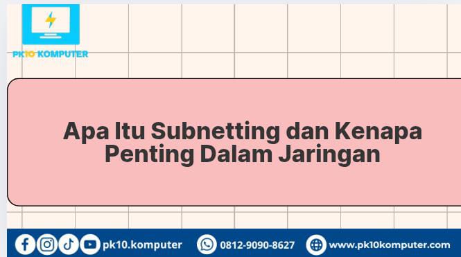 Subnetting adalah proses membagi satu jaringan besar (network) menjadi beberapa jaringan kecil (sub-network atau subnet). Tujuannya adalah mengelola IP address dengan lebih efisien dan meningkatkan performa serta keamanan jaringan.